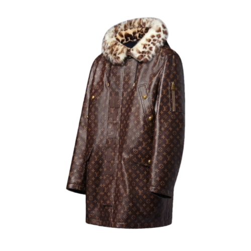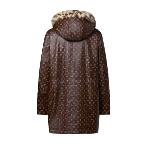 This exclusive leather parka is from the Fall-Winter 2025 show’s collaboration between Pharrell and Nigo. The supple calfskin is adorned all over with the iconic Monogram motif while an applied leather LV Japanese signature adorns the tab over the fastening, recalling Nigo’s roots. Soft leopard-printed shearling lines the hood, while old gold-toned metal snap buttons complete this striking signature piece.