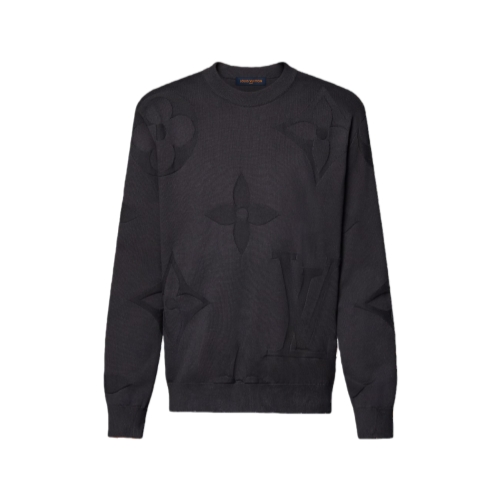 This smart black cotton crewneck is elevated with a tonal allover Monogram Macro motif, featuring large Monogram Flower and LV signatures incorporated into a jacquard knit with a subtly textured effect. With its soft hand and sophisticated graphic motif, this piece brings an elegant twist to a timeless look.