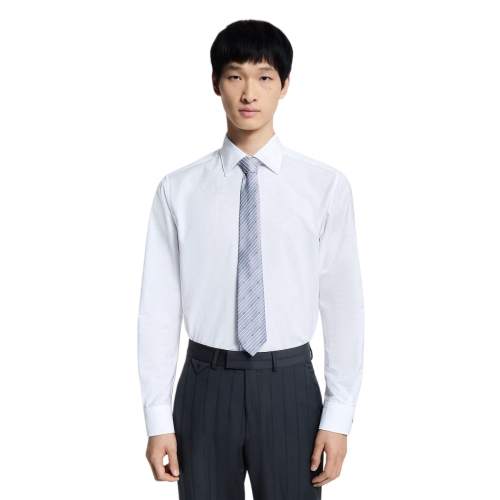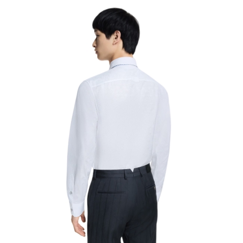 A wardrobe essential, this crisp white cotton shirt is adorned with a discreet jacquard Monogram motif all over. It can be layered with a Monogram-adorned suit for impeccable elegance, or styled with plain tailoring to introduce a subtle signature accent to a look. This timeless classic can by styled any number of ways, including elevating everyday looks.