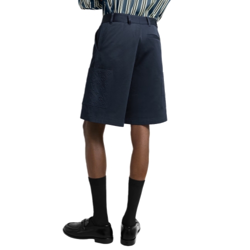 A fresh style for summer, these navy blue cargo shorts are cut from certified cotton twill with a slight stretch for comfort. Their classic silhouette is accented with two cargo pockets embellished with an embossed tone-on-tone Monogram motif. Casual yet distinguished, these shorts make an elegant set paired with a matching shirt.