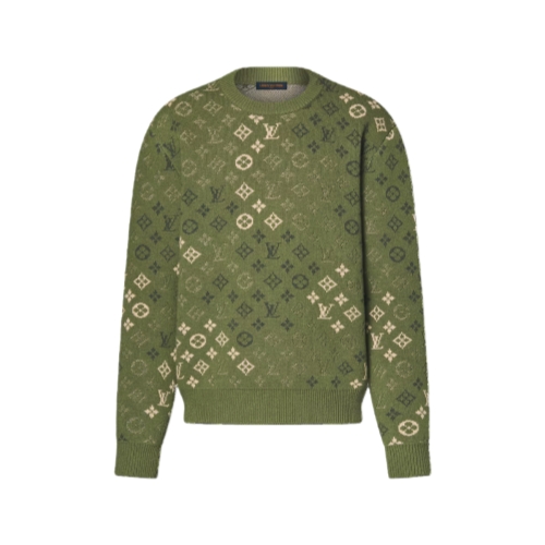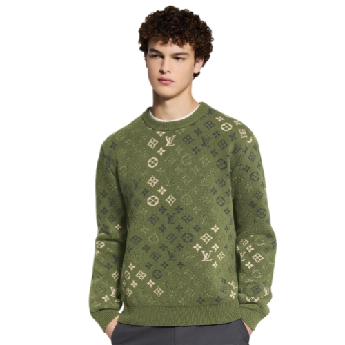 This long-sleeved pullover in earthy green tones is adorned with a graphic allover Monogram Surplus jacquard recalling camouflage motifs. The dappled green signatures against a khaki base are worked into an exceptionally soft wool-cashmere knit. This cozy piece can be easily layered into any wintery look.
