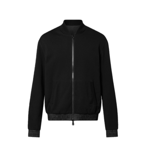 This lightweight reversible bomber is a mid-season essential. It has a shiny technical fabric featuring the Monogram motif on one side and compact cotton knit on the other. The collar is ribbed, while Monogram fabric covers the bottom hem and cuffs. It has a zipped double puller closure with knitted trim on the Monogram side. An embroidered LV on one kangaroo pocket completes this piece.