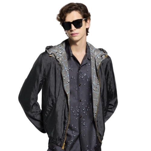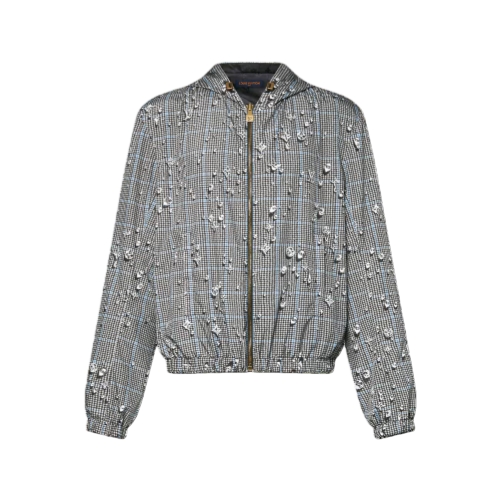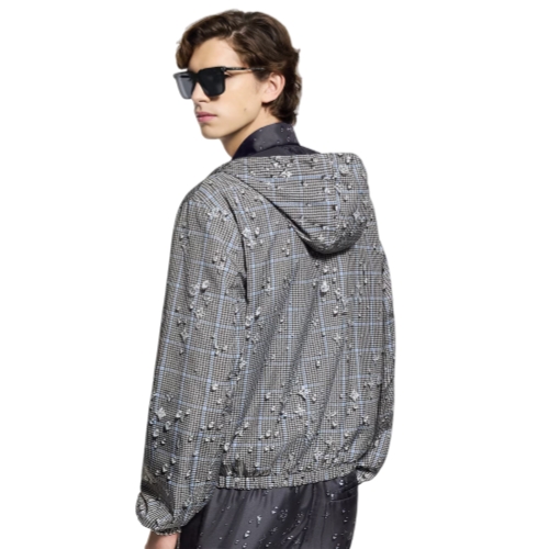 This light, reversible windbreaker offers two distinct looks. One side features a graphic Monogram Waterdrop print, featuring playful Monogram signatures resembling raindrops over an elegant glen plaid. The reverse comes in a timeless dark gray with a discreet tone-on-tone Monogram jacquard. Waterproof and easy to pack, this versatile piece is perfect for a weekend in the country or a rainy day about town.