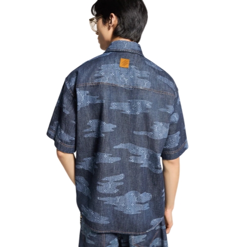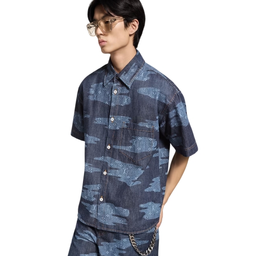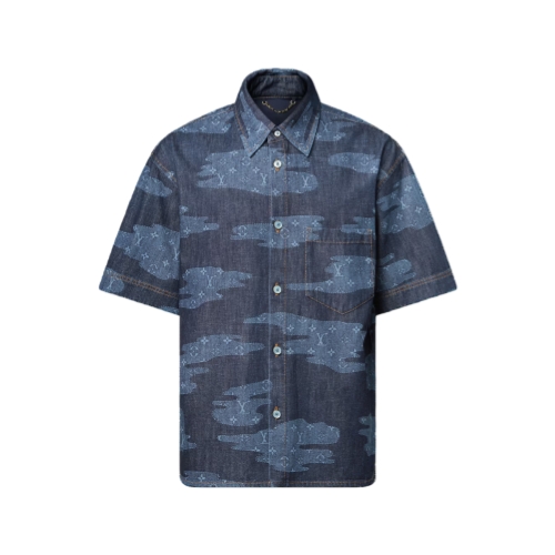 This graphic short-sleeved chambray shirt is a fresh choice for warm weather. It features a playful Monogram Clouds print from the Fall-Winter 2025 show, with patchwork-style clouds of Monogram signatures against a deep indigo base. Details include a nubuck Marque L.Vuitton Déposée label on the back, tobacco topstitching and lustrous mother-of-pearl effect buttons. Matching shorts make a standout look.