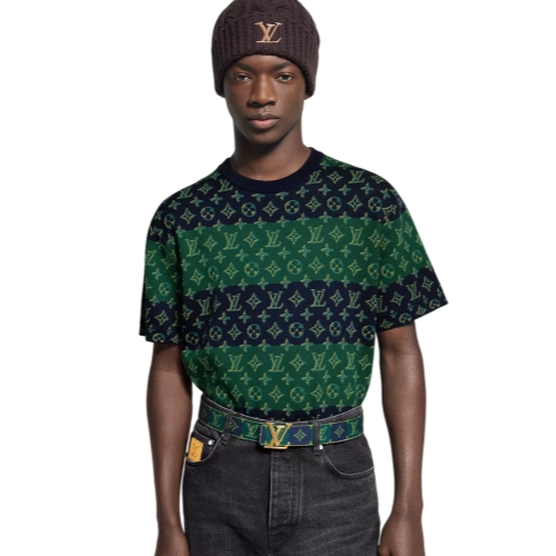 This graphic short-sleeved crewneck draws on this collection’s varsity theme with an allover Monogram Heritage motif, featuring bold horizontal dark blue and green stripes beneath a contrasting allover Monogram motif with a trompe l’oeil 3D effect. Executed in a sophisticated jacquard, this refined take on a sporty traditional style brings a preppy twist to everyday looks.
