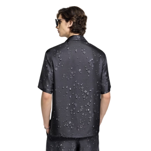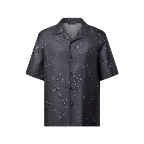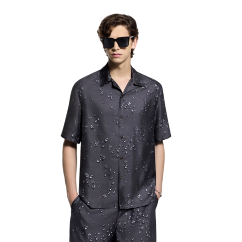 This dark gray short-sleeved shirt is crafted from fluid silk twill with an easy open collar. It is adorned with a Monogram Waterdrops print, which turns the iconic House signature into playful trompe-l’oeil rain droplets inspired by the weather in this British countryside-themed collection. Matching drawstring shorts make a chic and effortless resort look.