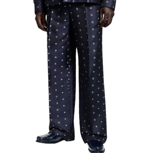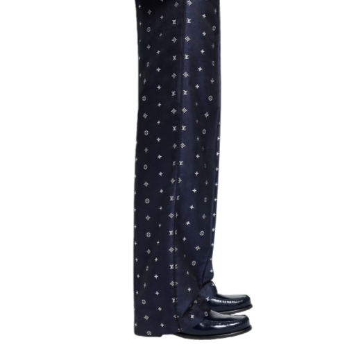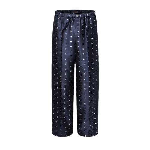 These fluid pajama pants are both sophisticated and effortless for evening occasions. Crafted from sumptuous navy blue organic silk, they are adorned with a graphic Spaced Monogram jacquard featuring contrasting white signatures, while tonal ribbon piping accents the legs and a Marque L.Vuitton Déposée label signs the elasticated waist. A matching pajama shirt makes a contemporary evening ensemble.