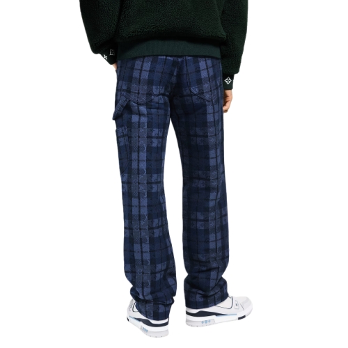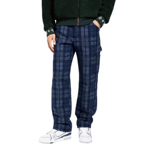 These denim workwear pants are elevated with this collection’s Monogram Tartan motif, executed in a sophisticated indigo jacquard. Workwear details include a leather jacqueron with embossed signatures on the rear waist, a patch pocket on the left leg and a hammer loop. A black pearl-effect button and rivets add a chic twist. Pair with a matching overshirt for a standout set.