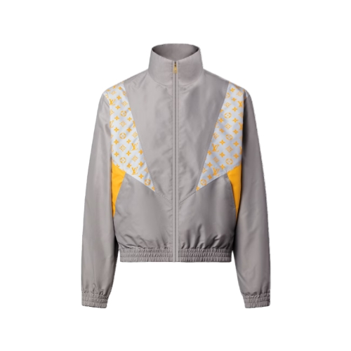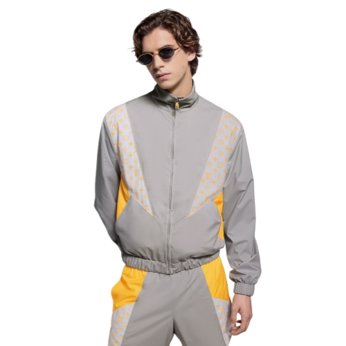 Crafted from light technical fabric, this sporty tracksuit top is constructed from silvery gray and saffron-toned panels with printed Monogram Glow inserts lending a graphic signature accent. A tall collar, zippered closure and elasticated waist and cuffs ensure comfort and ease. Matching shorts make a fashion-forward set that is perfectly suited to this collection’s dandy traveler.