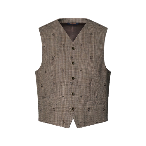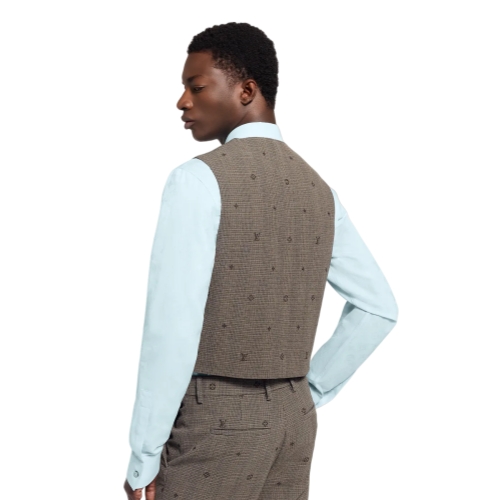 This elegant vest is tailored in a fine wool jacquard inspired by British sartorial traditions. It features a Monogram Prince of Wales pattern in subtle brown tones, adorned with a spaced Monogram all over. Perfect for this collection’s dandy on a visit to the British countryside, it can be worn as part of a three-piece suit.