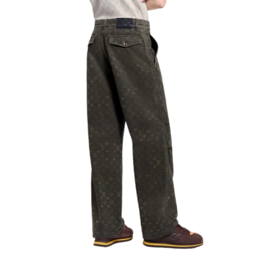 These denim pants are conceived with a waxed treatment for changeable weather and have a relaxed fit with knee darts for comfort and ease. An allover Monogram Surplus print adorns the dark khaki base, while a leather Damier jacqueron signs the back. Pair with a matching tailored jacket for a rugged twist on urban style.
