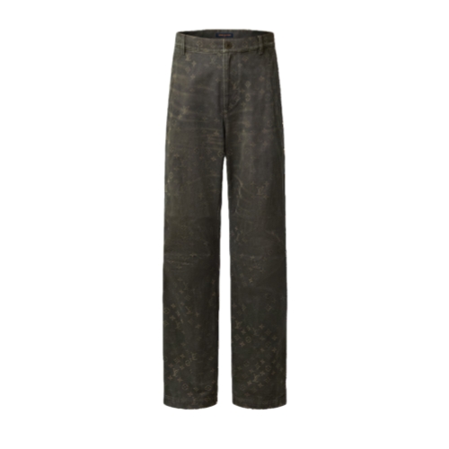 These denim pants are conceived with a waxed treatment for changeable weather and have a relaxed fit with knee darts for comfort and ease. An allover Monogram Surplus print adorns the dark khaki base, while a leather Damier jacqueron signs the back. Pair with a matching tailored jacket for a rugged twist on urban style.