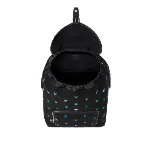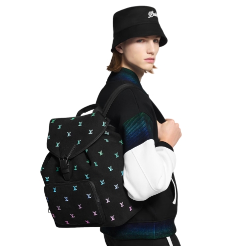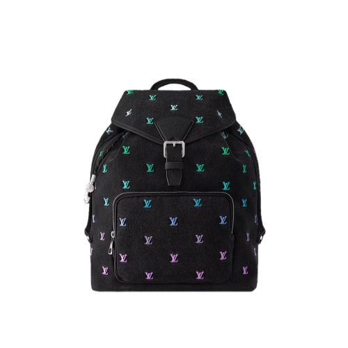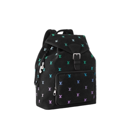 The roomy Montsouris Backpack is crafted from LV Blason Denim, translating music into Pharrell Williams' fashion language. The gradient treatment of the colored LV Initials stands out against the black-washed denim. Practical and stylish, it features a front zipped pocket for easy access to essentials and closes with a drawstring and a magnetic buckle strap.