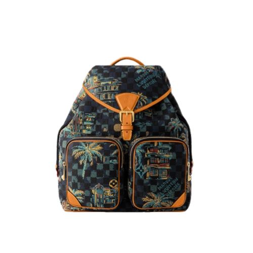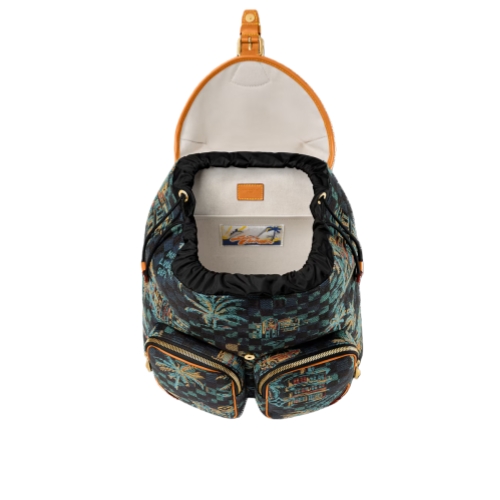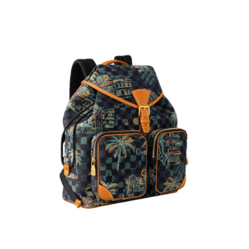 Recognizable by its rounded shape, drawstring closure, and comfortable shoulder straps, the Montsouris Cargo Backpack turns heads in jacquard cotton with a woven design depicting Miami and its vibrant nightlife. Finished with natural leather trim, the design takes on a slight vintage feel. The pack now features two outside pockets on the front, adding convenience.