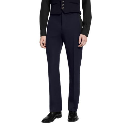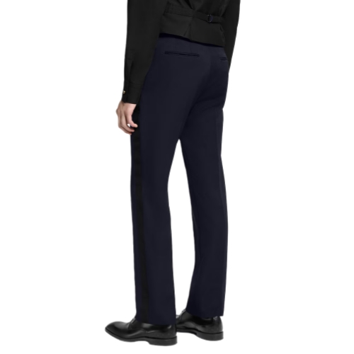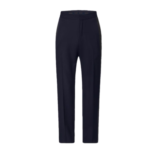 These chic tuxedo pants are crafted from fine virgin wool grain de poudre suiting in an elegant navy blue. Satin bands embellish the outside of each leg, while a Marque L.Vuitton Déposée label adorns the back of the adjustable waist, which has signature buttons ensuring a perfect fit. A matching jacket and vest make an impeccable evening look.