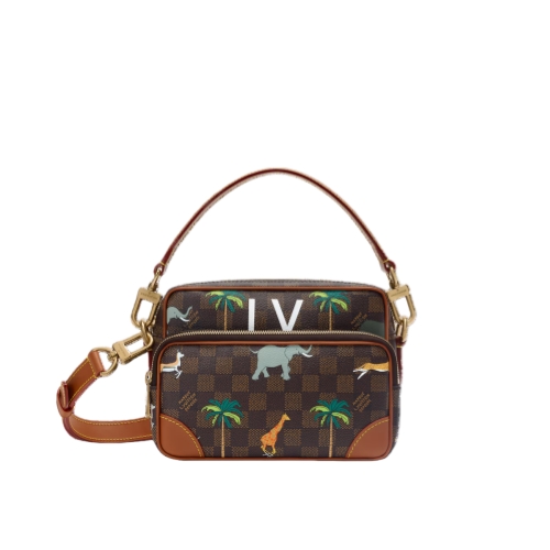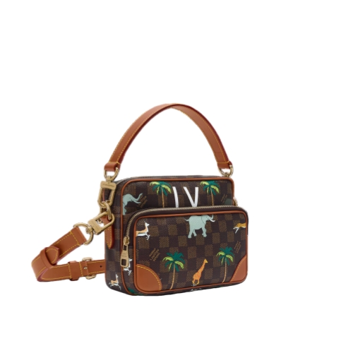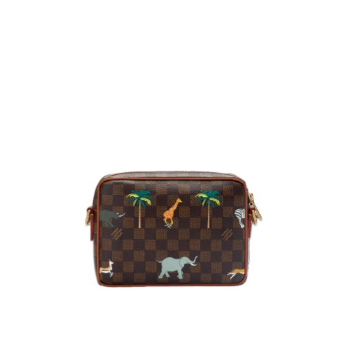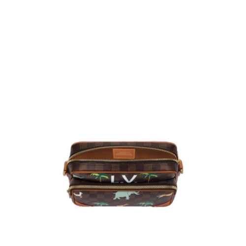 The Nil MM cross-body bag channels retro appeal with its spacious front zipped pocket and Damier Heritage coated canvas, animated by wild animals charging through palm trees. Part of The Darjeeling Limited collection, it includes a removable, adjustable strap and a detachable top handle for versatile carry.