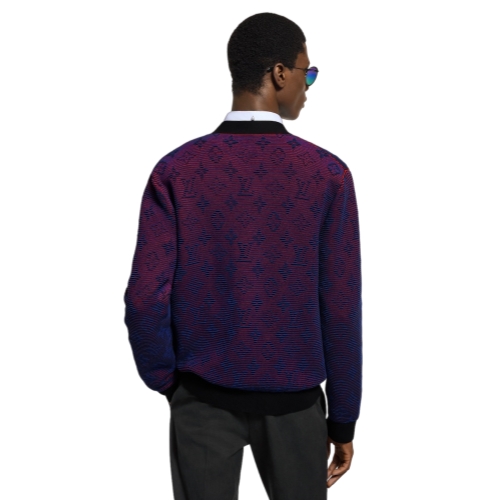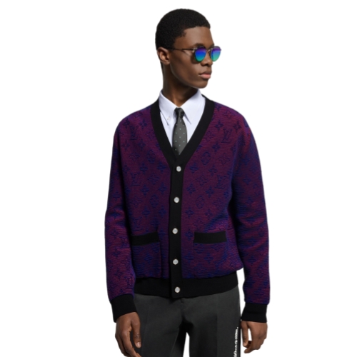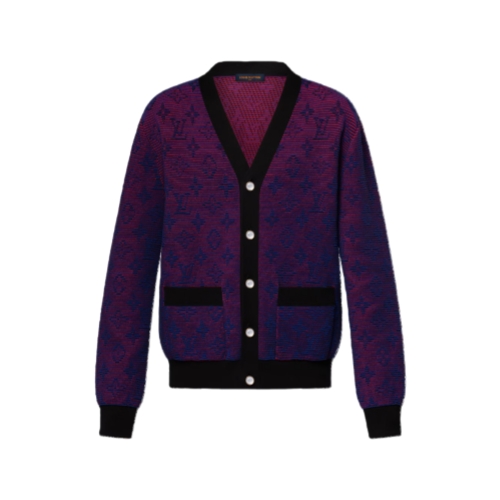 This sophisticated cardigan is crafted with an eye-catching optical effect. Knitted in organic cotton in purple tones, it showcases Louis Vuitton savoir-faire with a jacquard allover shifting Monogram motif overlaid with gradient-effect stripes. Black trim adds a preppy vibe, while pearly buttons add a dandy finishing touch.