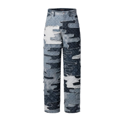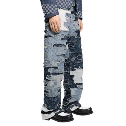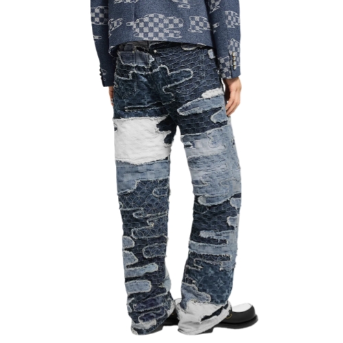 These patchworked denim skate pants are from the Fall-Winter 2025 collaboration between Pharrell and Nigo. Inspired by ancient mending techniques from Nigo’s native Japan, they are meticulously handcrafted from six different signature fabrics and assembled in a cloud-like collage with a textured vintage finish. A nubuck Mini Damier jacqueron signs the back, while pearly rivets adorn the pockets. A matching bomber makes a total look.