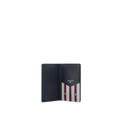 The Pocket Organizer compact wallet is fashioned from Monogram Heritage coated canvas in a refreshing colorway evocative of luxury ocean liners. It’s signed “Marque L. Vuitton Déposée” on the front and lined in striped cowhide leather. Three card slots and five inside pockets make it functional, as does the pocket on the outside.