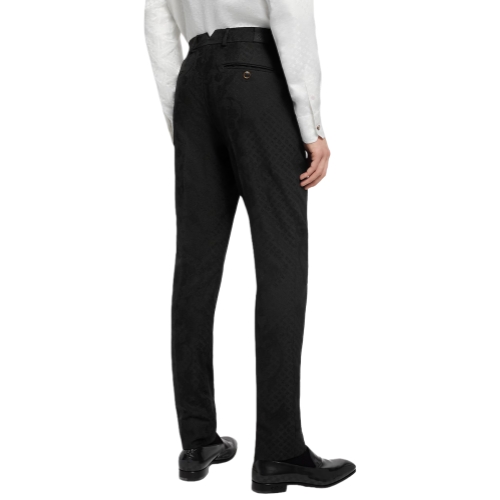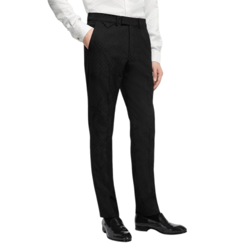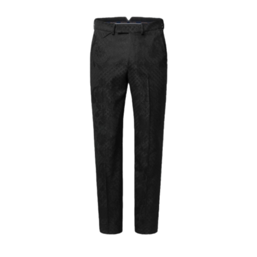 These chic black evening pants are crafted from a luxurious wool jacquard featuring a tone-on-tone Monogram Wildflowers motif with a sumptuous textured finish. Tailored with an elegant Pont Neuf fit, they are signed with an LV-embroidered triangular tab on the right hip and a Marque L.Vuitton Déposée label on the rear waistband. A matching jacket makes a sophisticated suit.