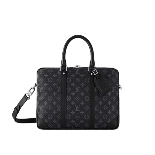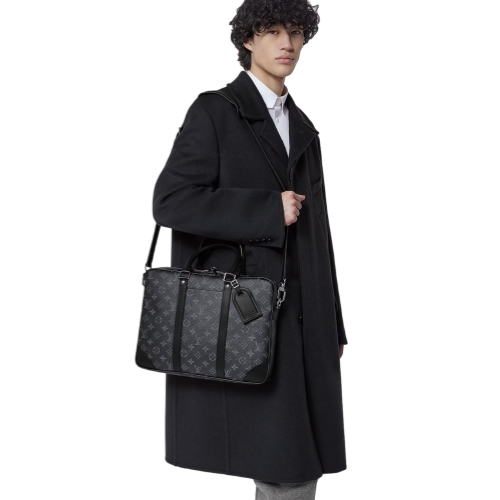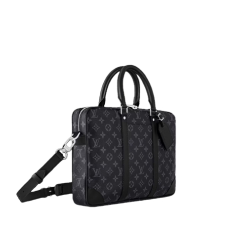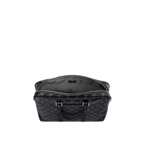 The timeless black-and-gray colorway of Monogram Eclipse canvas perfectly complements the pure lines of this Porte-Documents Voyage PM briefcase. Black-leather top handles, side bands, and reinforced corners structure the bag’s design. A removable and adjustable strap and two top handles give carry options.