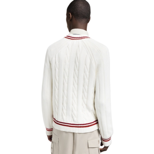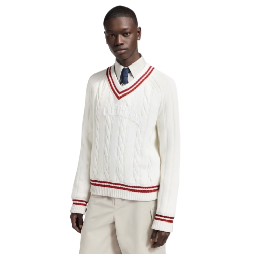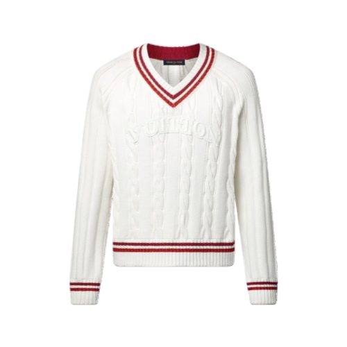 This retro v-neck pullover draws on this collection’s college sports theme. It is crafted with a chunky white cable knit and finished with striking red and burgundy stripes on the collar, cuffs and waist. An embroidered and embossed white Vuitton patch adorns the chest, bringing an authentic preppy twist to everyday looks.