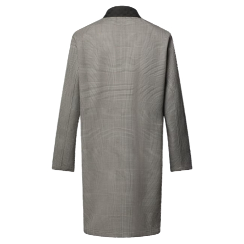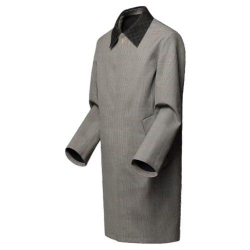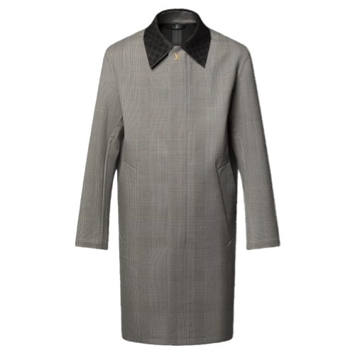 This water-repellent tailored raincoat is a light and elegant mid-season layer for business looks. It is crafted from a fine wool-cotton Glen check in elegant gray tones and is accented with a suede Damier collar. The taped seams are adorned with LV signatures, while metal Monogram Flower eyelets under the arms ensure breathability.