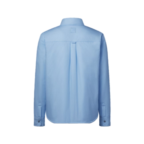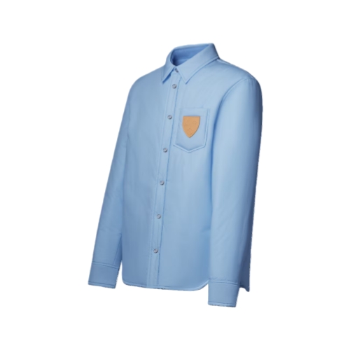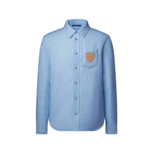 This reversible long-sleeved pale blue cotton overshirt is lightly padded for warmth and perfect for a casual après-ski look. Inspired by classic menswear shirts, a tonal LV Stripe jacquard incorporating LVs and Monogram Flowers adorns one side, while the plain reverse is elevated with a VVN-colored leather signature patch. Each side is finished with hanger loops and trompe l'œil pearly snap fastenings that look like regular shirt buttons.