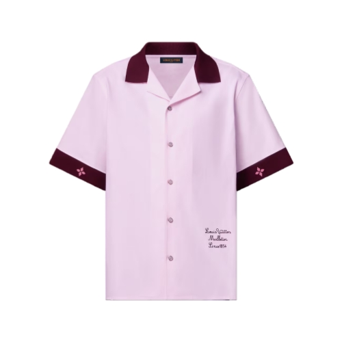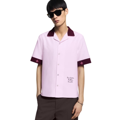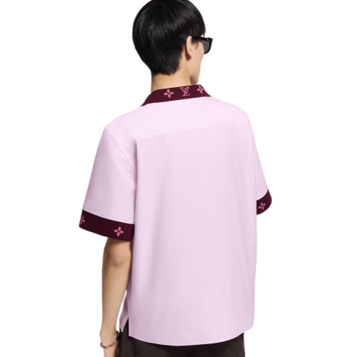 This short-sleeved cotton shirt brings a fresh, preppy mood to a look. It is crafted from certified cotton in soft pink tones with a contrasting ribbed collar and cuffs sporting tonal intarsia signatures. Delicate Louis Vuitton Malletier embroidery adorns the bottom left, while mother-of-pearl effect buttons add a chic finishing touch.