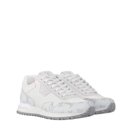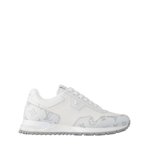 The Run Away sneaker is revisited in Monogram grained calf leather for the Monogram Park theme of the Spring-Summer 2025 Precollection. This emblematic model is characterized by its wedge-shaped outsole, inspired by running shoes, which features hand-finished details. It bears the LV Initials on the tongue and the Louis Vuitton signature on the back.