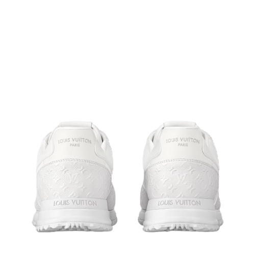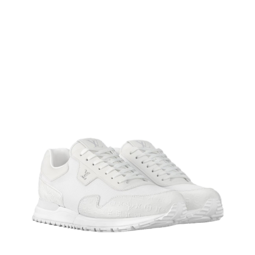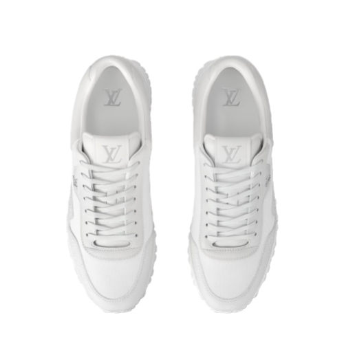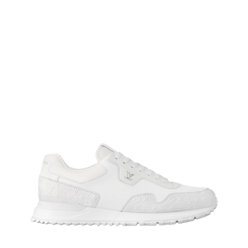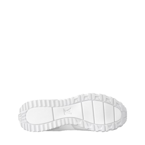 This refined, monochrome edition of the Run Away sneaker combines technical mesh with Monogram-perforated calf leather. This emblematic model, inspired by running shoes, is notable for its wedge-shaped outsole with hand-finished details, including leather trim and a metal plate. It is signed with a silver-toned LV Initials accessory on the side.