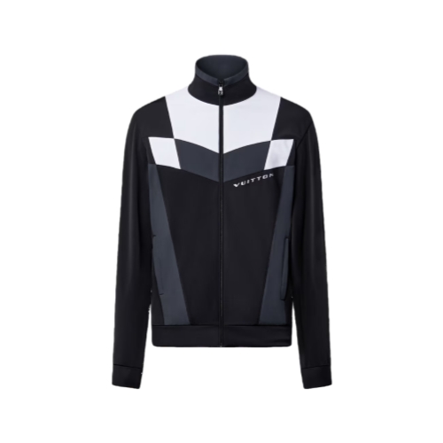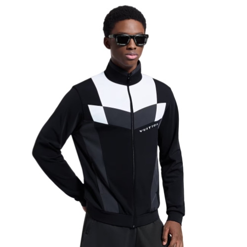 This black tracksuit top combines fashion and functionality. The soft and breathable technical fabric provides warmth and insulation with 4-way stretch for ease of movement. Sporty gray and white inserts create a flattering color-blocked look, embellished with reflective Vuitton lettering on the chest. A matching T-shirt and shorts make a coordinated set.