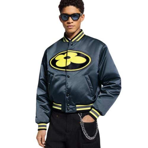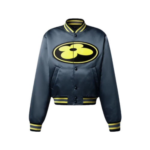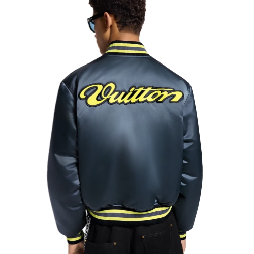 This metallic gray satin baseball blouson from the Fall-Winter 2025 show sets off bold citrus yellow signatures, including a graphic LV Flower patch on the front and a cursive Vuitton on the back. The colors are echoed in the tricolor ribbing on the collar, cuffs and waist. A lightly quilted interior with hidden pockets completes this versatile statement piece.