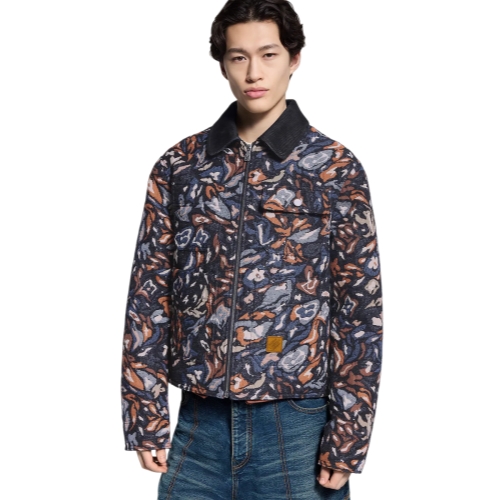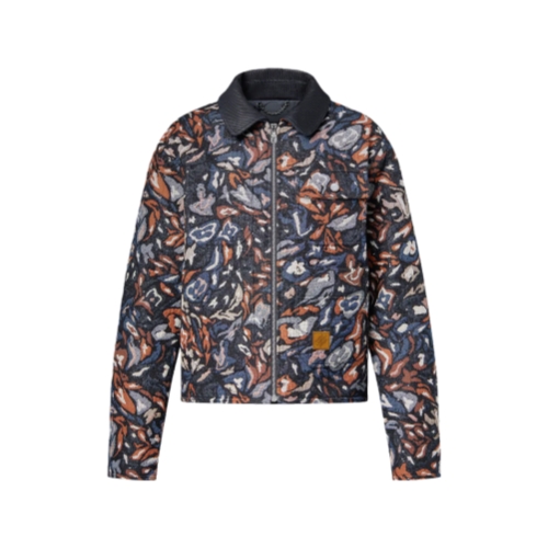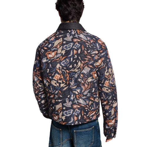 This exclusive jacket is crafted from a sophisticated tapestry-like jacquard adorned with embroidered sequins. It showcases the Fall-Winter 2025 show’s graphic LV Camo motif incorporating Monogram signatures in rich graphite and terracotta tones. Workwear accents include a ribbed corduroy-effect leather collar and patch pockets with silvery rivets, while a leather Marque L.Vuitton Déposée patch signs the front. Complete with a quilted lining.