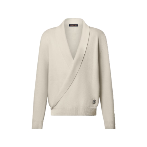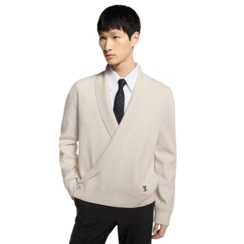 This elegant ivory wrap-over cardigan is inspired by this collection’s dandy on a transatlantic cruise. Crafted in a finely ribbed wool knit, it has a plunging shawl collar and is accented with a silver-toned LV ornament and LV-engraved pearl-like buttons. This piece can be styled in lieu of a jacket for a sophisticated and contemporary evening look.