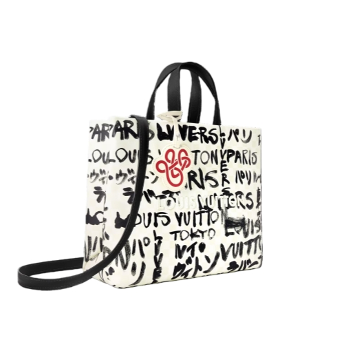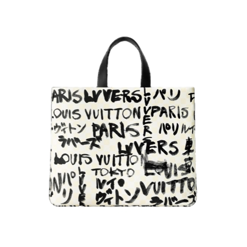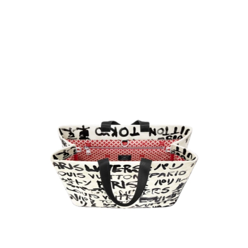 The result of Pharrell Williams' collaboration with Japanese designer Nigo, this Shopper Tote MM is stunning. Hand-drawn text in black ink overlays the signature white-on-white Damier checks, showcasing Nigo’s distinctive style. The words “Louis Vuitton,” “LVvers,” “Paris,” and “Tokyo” appear in both French and Japanese. The tote is lined with Nigo’s red patterned cotton.