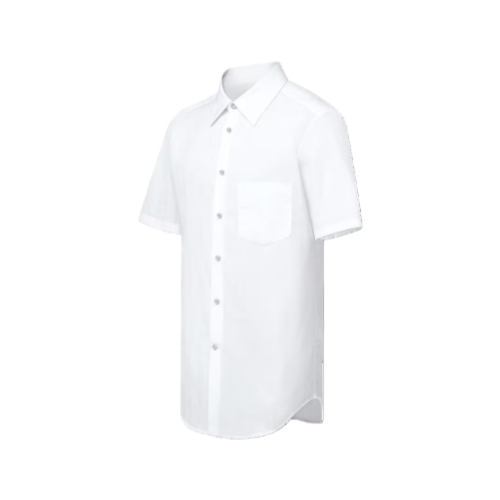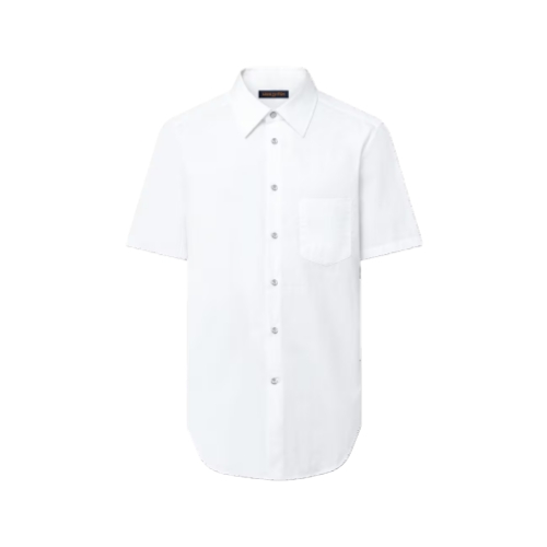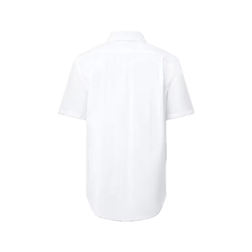 This short-sleeved white classic shirt crafted from certified cotton is a fresh choice for warm days. The fabric is adorned with a tone-on-tone jacquard Marque L.Vuitton Déposée Stripes motif, which lends a discreet signature accent to a formal ensemble. This piece can be layered with a matching deconstructed suit for a contemporary look.