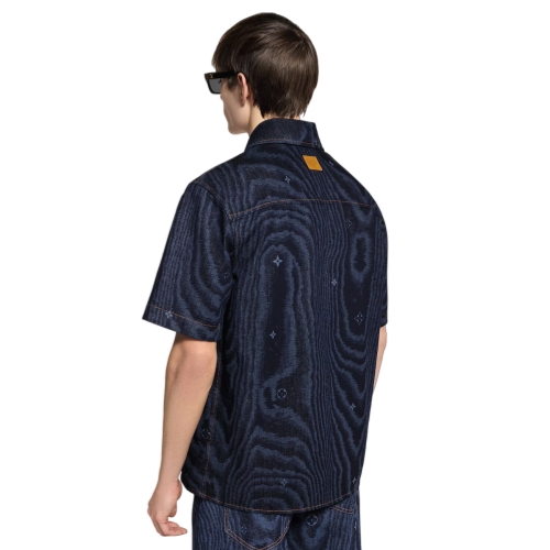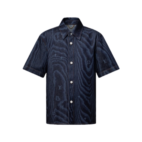 This summery short-sleeved denim shirt is given a chic twist with this collection’s graphic LV Moiré motif incorporating discreet Monogram signatures. The subtle tone-on-tone print creates a playful illusion of shimmering silk. Pearl-effect buttons bring a smart dandy accent while a Nubuck Marque L.Vuitton Déposée label signs the back.