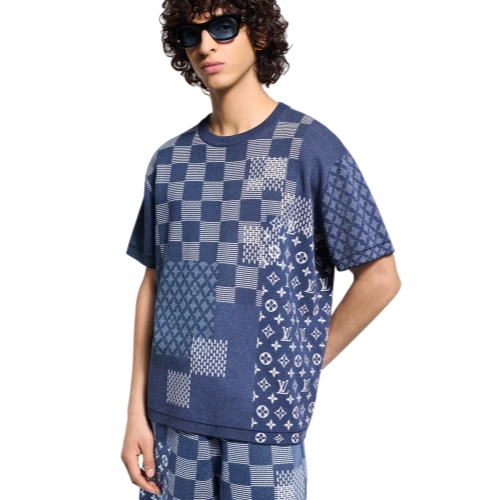 This summery short-sleeved cotton crewneck from Fall-Winter 2025 is elevated with a sophisticated intarsia patchwork of House signatures. Taking inspiration from this collection’s celebration of Louis Vuitton archives, it features different takes on the Damier and Monogram in soft indigo tones creating a graphic effect. This buy-now-wear-now piece has matching shorts for a total look.