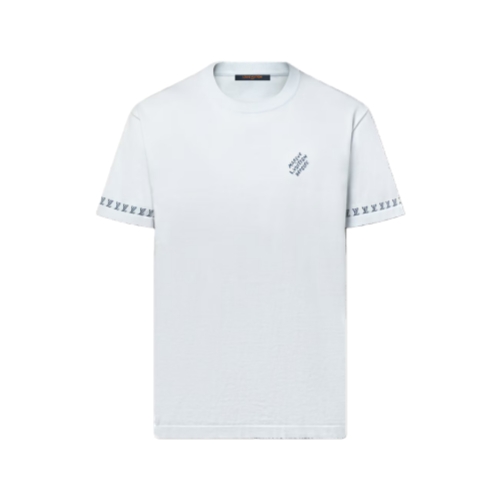 This smart light blue short-sleeved crewneck in a fine organic cotton knit is crafted with delicate contrasting jacquard signatures. These include a discreet Marque L.Vuitton Déposée on the chest and a band of LVs around the cuffs creating a neat graphic effect. This versatile piece brings a distinguished touch to everyday looks.