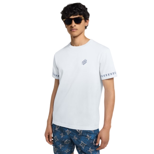 This smart light blue short-sleeved crewneck in a fine organic cotton knit is crafted with delicate contrasting jacquard signatures. These include a discreet Marque L.Vuitton Déposée on the chest and a band of LVs around the cuffs creating a neat graphic effect. This versatile piece brings a distinguished touch to everyday looks.