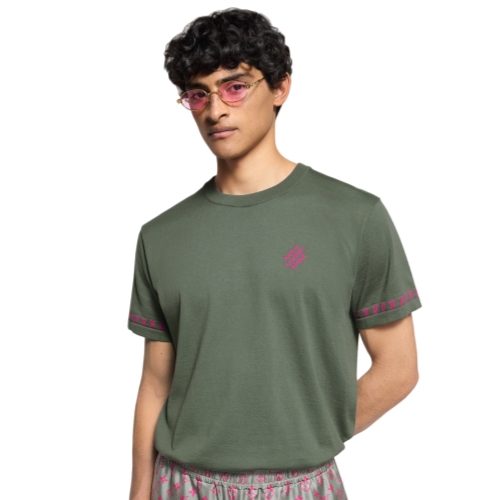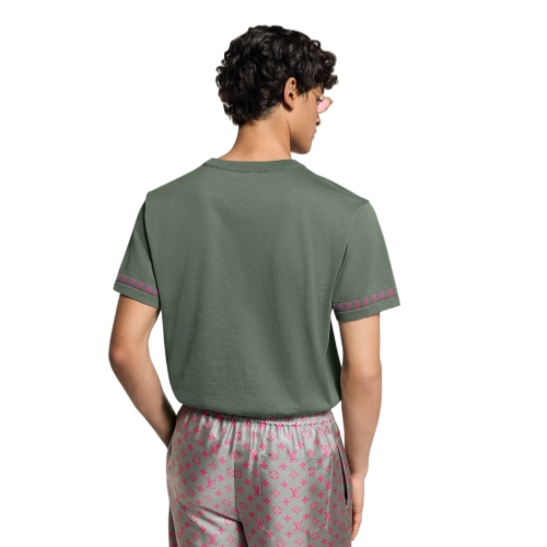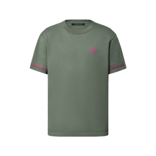 This sage green short-sleeved crewneck in a fine organic cotton knit is crafted with contrasting jacquard signatures that pop in bold fuchsia tones. These include a discreet Marque L.Vuitton Déposée on the chest and a band of LVs around the cuffs creating a graphic effect. This versatile piece brings a distinctive signature twist to everyday looks.