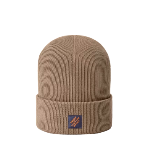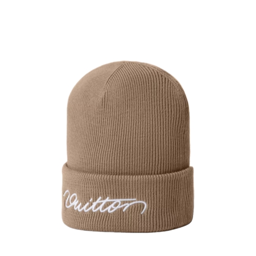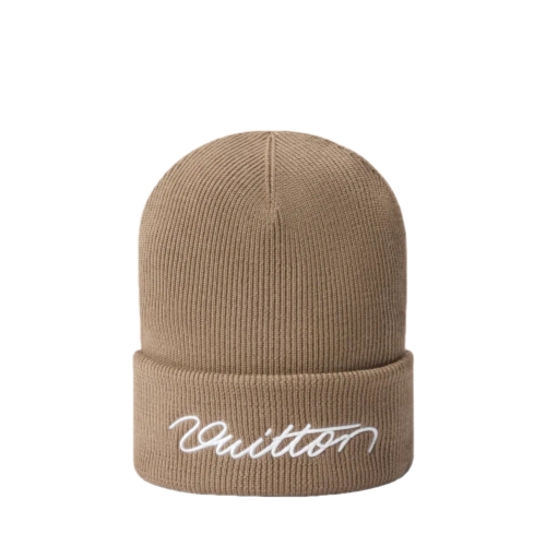 The Italian-made Signature beanie exudes an urbane spirit, the simplicity of the design amplifying its inherent confidence. The solid wool hat is adorned with a large, handwritten "Vuitton" on the front and a small woven label with the "Marque Louis Vuitton Déposée" signature at the back.