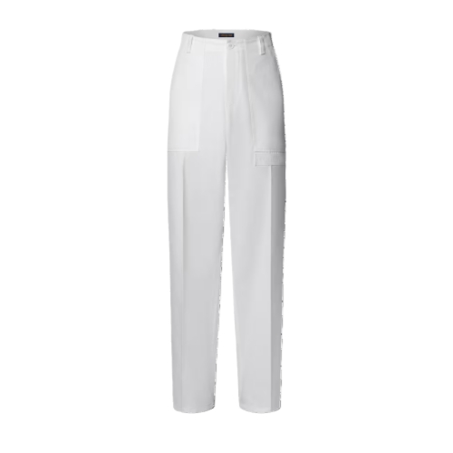 With their relaxed fit and workwear vibe, these cotton twill casual pants are perfect for everyday dressing. They are signed with a tone-on-tone Louis Vuitton on the left leg and a contrasting LV on the back right pocket, while a Louis Vuitton ribbon signs the interiors of the cuffs. Their elegant pale color complements this collection’s vibrant hues.