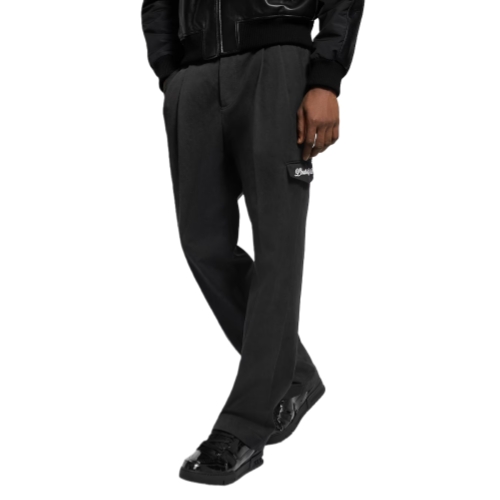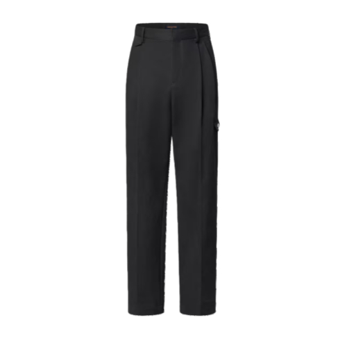 These cotton chino pants have a casual yet elegant silhouette with a pleated front, with flap and patch pockets adding a workwear twist. Applied signatures add a preppy accent, with an elegant embroidered Louis Vuitton in a cursive script on the left leg, while a rhinestone-embellished LV patch signs the back. The black color makes this a versatile piece for completing everyday looks.