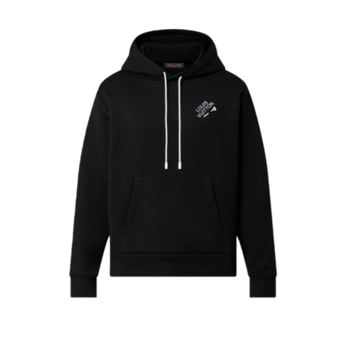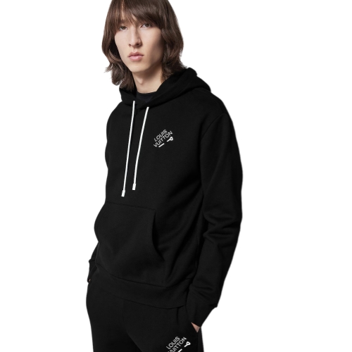 This smart hoodie is made from brushed back cotton felpa and has a lined hood, kangaroo pocket and a ribbed bottom hem and cuffs. It features one of this season’s iconic colors, set off by contrasting white cords and an embroidered white Louis Vuitton signature on the chest, underlined by a matching staple pin.