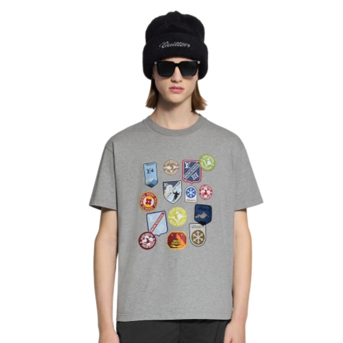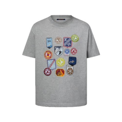 This short-sleeved T-shirt in soft gray jersey celebrates the art of travel with a playful mix of printed and embroidered LV Ski patches. The colorful and graphic designs, inspired by ski school badges, are richly detailed with House signatures. This casual piece brings a sophisticated accent to a winter vacation look.