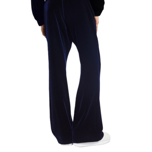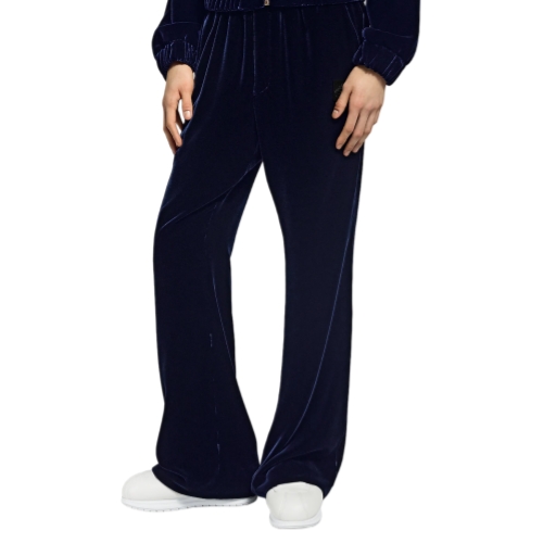 These velvet track pants lean into the Fall-Winter 2025 show’s Y2K references, elevating a sporty silhouette into the realm of chic day-to-evening wear. The lustrous navy blue silk-blend velvet is tailored with a fluid flared silhouette and an elasticated waist and signed with a beaded Marque L.Vuitton Déposée patch. A matching tracksuit top makes a chic and modern ensemble.