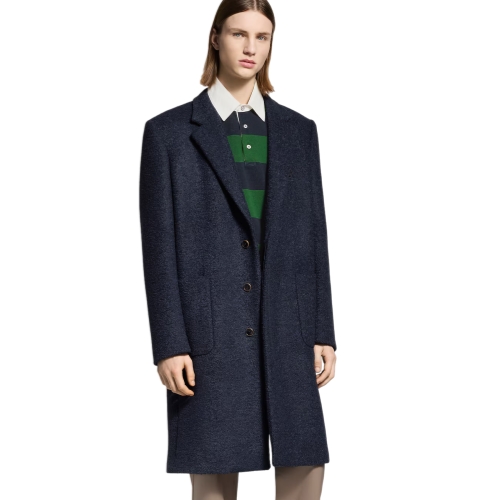 The elegant silhouette of this tailored wool coat is crafted from softly textured bouclette fabric in a luxurious blend of virgin wool and baby llama. A metal LV ornament embellishes the chest, while a leather Marque L.Vuitton Déposée patch adorns the back. Available in a timeless navy blue, this city essential can go everywhere, from the office to a weekend brunch.