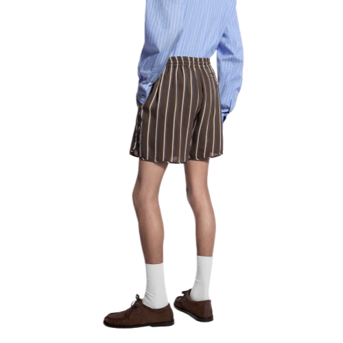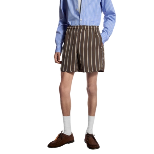 Embodying the effortless elegance of the Spring-Summer 2026 show, these shorts combine a sporty silhouette with a heritage striped fabric in rich brown tones. The comfortable elasticated waistband adds a soft drape to this graphic preppy style. Lending instant refinement to everyday looks, they make a chic set paired with a matching track top.